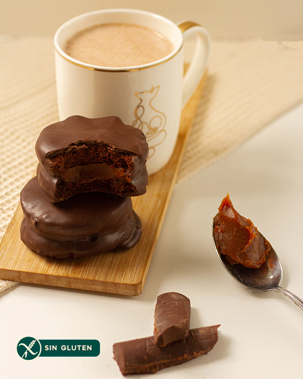 Dulce de leche, chocolate semiamargo, margarina, almidón de maíz, azúcar, huevo, harina de arroz, harina de trigo sarraceno, cacao amargo, harina de sorgo, goma xántica y propionato de calcio. CONTIENE HUEVO Y DERIVADOS LÁCTEOS.
