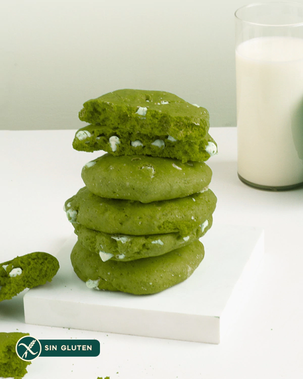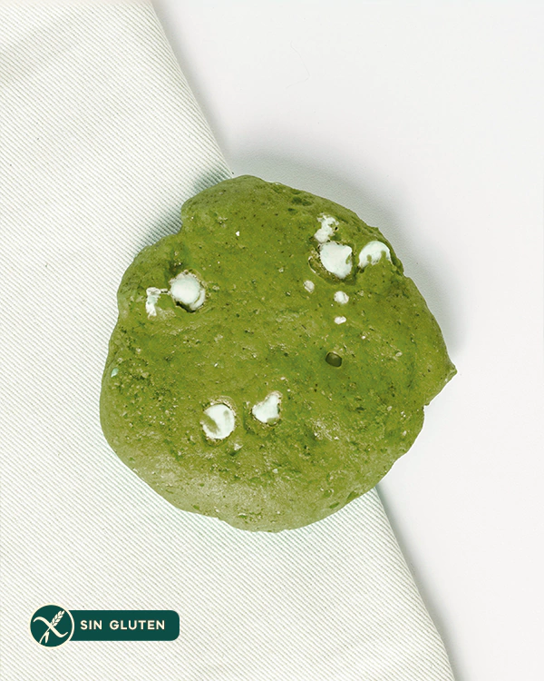 Ingredientes: Margarina, azúcar, harina de arroz, almidón de maíz, chips de chocolate blanco, huevo, fécula de mandioca, harina de trigo sarraceno, goma xántica, saborizante pistacho. CONTIENE HUEVO.